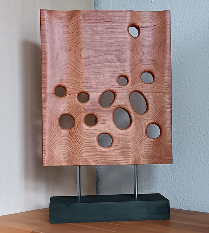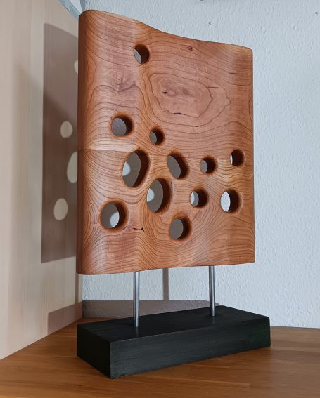 Ganz unterschiedliche Holzarten sind Ausgangsform für die Gestaltung von Holz-Skulpturen mittels Holzschnitzeisen. Würfel mit Durchbrüchen und runde große Scheiben werden so mit viel feiner Schleifarbeit zu schönen Objekten. Aber auch kleine Klötzchen können in Summe in farbigen Abstufungen zu Bildern kombiniert werden. Der Phantasie sind auch hier keine Grenzen gesetzt.